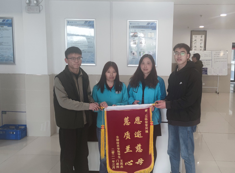 两位同学都说,在大半年交往的这些日子里,知道了宿舍管理工作的艰辛,从宿管阿姨身上,看到了勤勤恳恳、兢兢业业、毫无怨言,更学到了许多做人的道理和处事的方法。陪同两位同学赠送锦旗的生物技术学院党委副书记钱平介绍,学院一直致力于培养学生树立感恩、奉献、责任意识,希望同学们能够常怀感恩之心,感恩身边事,感恩身边人。